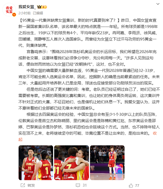 另一位博主"我爱女篮"则认为,老队员的缺席更多是出于休整考虑,并非意味着她们将退出国家队舞台。